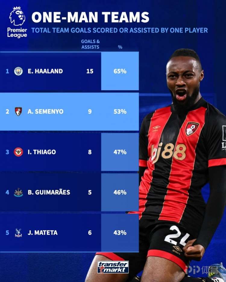 德国转会市场统计了球员本赛季英超参与进球数量占据球队总进球的比例,并列出榜单,哈兰德占比65%最高,塞梅尼奥占比53%第二。